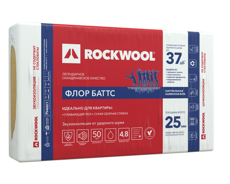 Жесткие гидрофобизированные теплоизоляционные плиты, изготовленные из каменной ваты на основе габбро-базальтовых пород. Плиты ФЛОР БАТТС предназначены для устройства акустических плавающих полов, а также для тепловой изоляции полов по грунту. Обладают динамическими характеристиками, отвечающими требованиям по защите от шума, и относятся к классу высокоэффективных звукоизоляционных прокладочных материалов.
